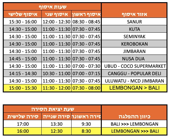 הורדה לפי אזורים: אם רכשתם כרטיס הכולל הסעות, מלאו את פרטי האיסוף בלבד, אין צורך למלא את פרטי ההורדה בבאלי ולמבונגן. ברגע שתרדו מהסירות, תתבצע חלוקה לרכבים לפי אזורי הורדה.